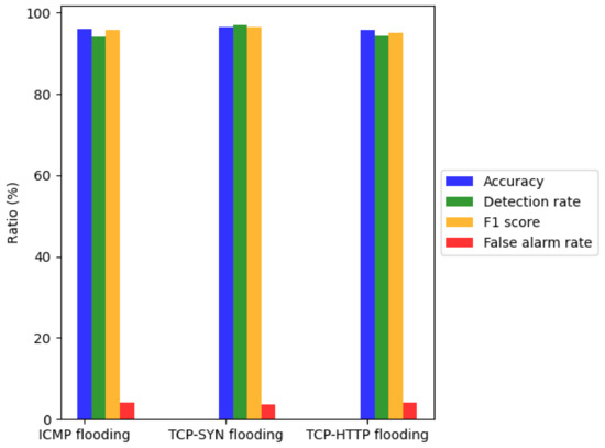 Figure 8 presents the detection performance of the period detector in three common types of EDoS attacks using the model parameters listed in Table 3. The results are summarized in Table 7. Accuracy, detection rate, false alarm rate, and F1-score, when detecting ICMP flooding attack are 95.896%, 94.208%, 4.104%, 95.831%, respectively. The results show that our model can accurately detect when an EDoS attack occurs, which will help the flow detector quickly detect abnormal flows.