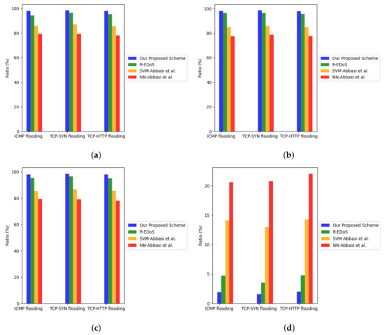 Detection performance comparison of the flow detector in different kinds of EDoS attacks. (a) Accuracy. (b) Detection Rate. (c) F1 score. (d) False alarm rate.