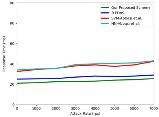 - Our scheme can detect and mitigate each abnormal flow in network traffic within an extremely short period of time, i.e., 0.54 s. This result highly outperforms other existing approaches, especially R-EDoS [35], which uses another variant of RNN and achieves pretty high accuracy in EDoS detection. The quick detection time makes the response time of the entire system much lower than other existing solutions despite the high amount of network.
