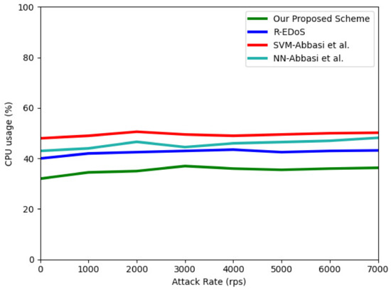In this section, we present the experiment results of the CPU usage of a victim server under the control of our proposed EDoS detection mechanism to evaluate the efficiency of our proposed model at the service provider’s end. We launched a TCP-SYN flooding attack with an attack rate of 7000 requests per second and a normal traffic rate of 400 requests per second during a 1-h period.
