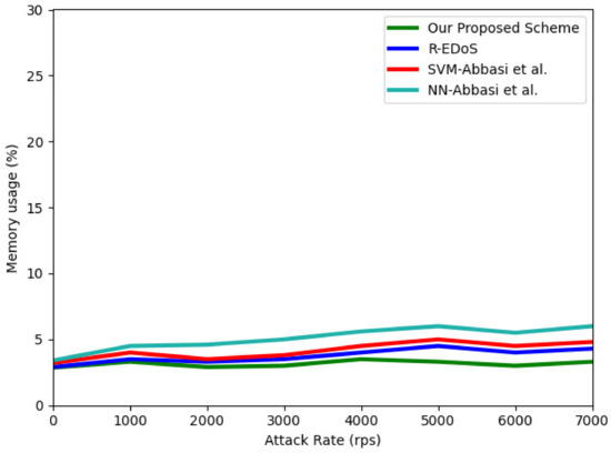 In this section, we evaluate the efficiency of our proposed mechanism in terms of CPU usage and memory usage, which are two representative resource consumption metrics. Figure 12 and Figure 13 show the results of the CPU and memory utilization, respectively. These results were obtained when we simulated an EDoS attack with different numbers of requests of 1000–7000 per second during a 100-s period. For the CPU usage, the result shows the CPU usage of the physical machine when extracting the features and detecting each flow. Because the data sequence length is five, our model consumes the lowest CPU usage (32% to 36.3%) compared to SVM-Abbasi et al. (48% to 50.2%), NN-Abbasi et al. (43% to 48.2%) [13], and R-EDoS [15] (40% to 43.2%). With respect to the memory utilization, our proposed scheme only consumes from 2.8% to 3.5%, whereas the consumption of the GRU-based R-EDoS method is approximately 4% higher than that of our two-phase model. Overall, our proposed model consumes fewer resources than the SVM-Abbasi et al., NN-Abbasi et al., and GRU-based R-EDoS models.