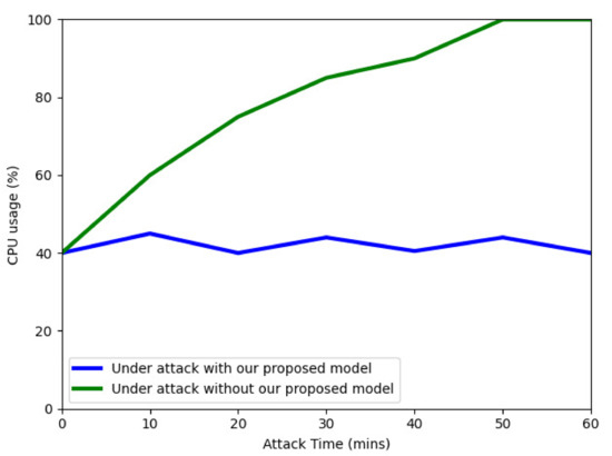 However, when being protected by our proposed model, the average CPU usage of the victim server is only approximately 40% during a 1-h period. This means the cloud user does not need to pay for a second virtual machine when being protected by our proposed model while under EDoS attacks.