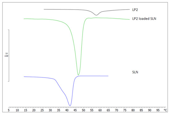 The calorimetric curve of LP2-loaded SLNs was quite different, as there was no evidence of the previously mentioned shoulder, and the main peak was sharper and centered at 46.89 °C. These results suggest that the incorporation of LP2 affected the calorimetric behavior of SLNs; in particular, the absence of the shoulder could indicate a homogeneous distribution of the components of the SLN.