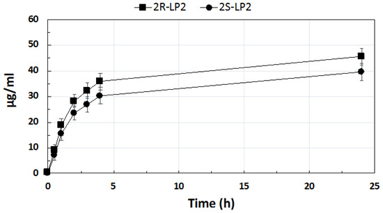 After 24 h, the percentage of LP2 released, calculated as the mixture of 2R and 2S diastereoisomers, was 50.2%. Both diastereoisomers showed an initial fast release followed by a second phase of a slower release. Similar in vitro release profiles have already been reported by other authors for lipophilic drugs loaded into SLNs [29,30]. It is interesting to note that, although the release profile of both diastereoisomers was similar, the 2R-LP2 release rate was greater than that of 2S-LP2. As previously mentioned, diastereoisomers share identical molecular formulas, atom-to-atom linkages, and bonding distances, but the different spatial disposition of the chemical groups bonded to the chiral center could affect their ability to interact with the surrounding environment. Calculating Log p values of 2R- and 2S-LP2 using Marvin 20.11.0, ChemAxon (https://www.chemaxon.com, accessed on 24 March 2021), the same value (Log P 4.61) for both isomers was obtained. On the contrary, the lipophilic index, which stemmed from the interaction between the analyzed compound and the stationary (lipophilic) and mobile (hydrophilic) phases in the HPLC column, highlighted that 2S-LP2 was more lipophilic (Log K 0.66) than 2R-LP2 (Log K 0.60), thus suggesting a greater affinity of 2S-LP2 for the lipid core of SLNs, which, in turn, could lead to a slower release from the nanoparticles.