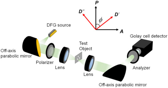 For imaging measurements, a test object was set at the focal point of a transmission imaging system, as shown in Figure 1. A THz wire grid polarizer and an analyzer were inserted in the THz beam, as shown in Figure 1. The THz beam from the DFG source was horizontally polarized. As shown in the inset of Figure 1, φ is the angle of the molecular long axis of the sample with respect to the wire direction of the polarizer. THz imaging was demonstrated with cross-Nicol configuration and open-Nicol configuration. The cross-Nicol configuration was mostly used for imaging of birefringence samples, such as biomedical samples [19]. For the cross-Nicol configuration, the polarizer and the analyzer had an orthogonal relationship, whereas, for the open-Nicol configuration, the polarizer and the analyzer had a parallel relationship.