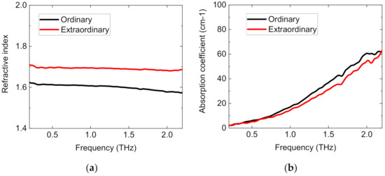 Figure 2a,b show the refractive index and absorption coefficient of the LCP, respectively. The sample was rotated such that its direction was perpendicular and parallel to the polarization of the THz beam. The optical properties (refractive index and absorption coefficient) for both the ordinary and extraordinary polarization can be determined, with the THz electric field polarized perpendicular or along the molecular long axis [12]. The measurement bandwidth was limited to 0.2–2.2 THz due to the attenuation loss of the sample. As shown in Figure 2a, we observed a birefringence △n = 0.1 across this frequency range. The refractive index for the extraordinary axis was higher than for the ordinary axis, similar to the other liquid crystal materials [11,12,13]. The absorption coefficient for the ordinary axis was slightly higher than for the extraordinary axis, similar to the other liquid crystal materials [11,12,13].