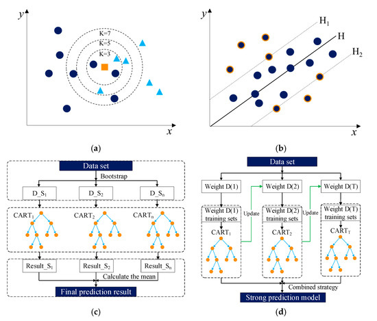 Common machine learning (ML) algorithms: (a) K-nearest neighbors (KNN); (b) support vector regression (SVR); (c) random forest (RF); (d) adaptive boosting (AdaBoost).