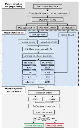 The problem of dynamic real-time prediction of SMA parameters can be transformed into a short-time sequence prediction task. The tunneling parameters of several periods in the past (also called the time window) are retrospectively used to predict the SMA parameters of the next period. With the advancement of EPB, the data sequence is continuous with roll, achieving dynamic real-time prediction. Based on this, we proposed the prediction framework of the SMA parameters by using four ML algorithms and four DL algorithms. As shown in Figure 3, the framework included three main steps: data collection and preprocessing, model establishment, and model comparison and evaluation.