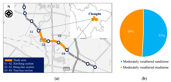 The data in this study is from Chengdu Metro Line 19 in China, with a total length of 43.186 km and a tunnel excavation diameter of 8.64 m. The location of the project is shown in Figure 4. All lines are underground, and there are 12 underground stations with an average station spacing of 3.58 km. Line 19 is still under construction, and we collected a large amount of data from five EPB shield machines in Xin-hong, Hong-tian, and Tian-hua sections. The total length of these sections is about 4 km. The surface layer is miscellaneous fill and plain fill, and the strata crossed are mainly medium weathered sandstone and medium weathered mudstone. The geological proportions along the line are shown in Figure 4b. The overall geological condition is simple, suitable for excavation by EPB shield machine.