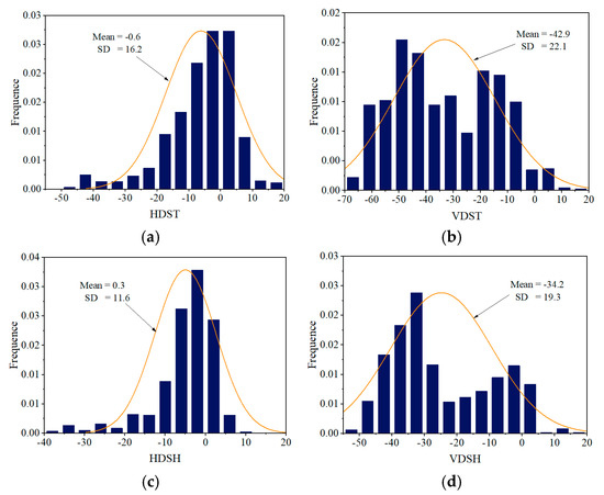 Histogram of SMA parameters: (a) horizontal deviation of the shield tail (HDST); (b) vertical deviation of the shield tail (VDST); (c) horizontal deviation of the shield head (HDSH); (d) vertical deviation of the shield head (VDSH).