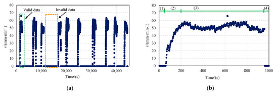 In tunnel construction, the length of one ring is not completed in a single excavation. One ring is usually cut into several segments due to the capacity of slag discharge and grouting. When the programmable logic controller (PLC) stores the effective drilling cycles, it also records a large amount of invalid data that are not related to the tunneling process, as shown in Figure 7a. The first step of data preprocessing was to eliminate invalid data and filter out valid data.