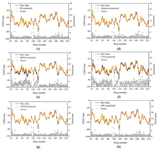 Furthermore, KNN has few parameters to be optimized [13], and the calculation results mainly depend on the calculation distance, which determines that KNN may produce poor prediction results for large-scale data features (Figure 8a). Based on the decision tree algorithm, the RF and AdaBoost algorithms have the same regressors, and their prediction results are obtained by these regressors [33,38]. Thus, when solving the prediction problem of SMA, the effects of RF and AdaBoost algorithms were better than KNN algorithm and SVR algorithm [29]. As the simplest DL algorithm, BPNN is composed of a multilayer stack of simple modules, and the model with 5~20 hidden neurons can achieve extremely complex functions [40]. However, BPNN structure cannot store historical information. With a depth of network structure increase, gradient explosion or disappearance will occur, which means that it is not suitable for predicting time sequence data. Similarly, CNN predictors based on convolution dimension reduction have good performance in solving image recognition problems [45,64] but are slightly inadequate in processing time sequence data. The LSTM and GRU, which are good at processing time sequence, had the best prediction result.