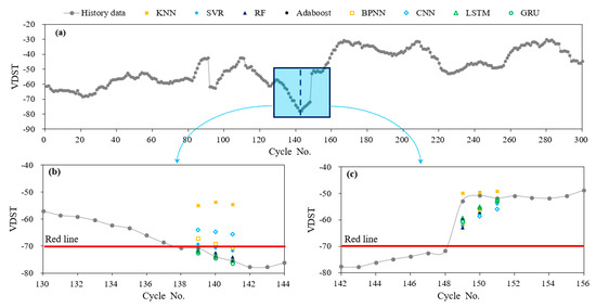 Prediction results of VDST by warning predictor: (a) a case of actual VDST deviation; (b) warning start; (c) Warning end.