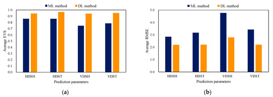 Average evaluation indices of four output variables of ML and DL algorithms: (a) average EVS; (b) average RMSE.