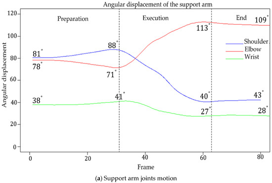 Figure 6 shows the angular displacement patterns generated from the average values of the twenty subjects. During the preparation phase, the initial angular displacement at the support shoulder joint was greater at an angle of 81° compared with the dominant shoulder joint. However, both the dominant elbow and the wrist joints displayed a greater initial angular displacement compared with the support joints at the preparation phase, at with angular values of 106° and 48°, respectively. At the end of preparation phase, both the support and dominant shoulders exhibited upward flexion movements with a slight increase in the flexion angle by 8.6% and 17.0%, respectively. This was similar to the wrist joint that exerted a slight increment in the ulnar deviation angle in both the support and dominant wrist angular movements by 8% and 10% respectively. In contrast, both the support and dominant elbows showed a slight decrease in the flexion angle in the extension direction at the end of the preparation phase by 9% and 5%, respectively.