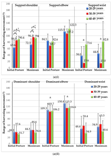 (a) The range of harvesting movements for initial and maximum postures and (b) the active range of harvesting movements during the three phases of the push-pull-cutting movement by age group for (i) the support arm and (ii) the dominant arm. The asterisk * denotes statistically significant differences and the letter a denotes that the measures were transformed into normal distributions.