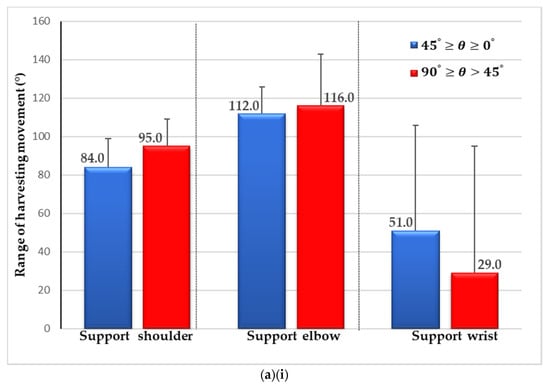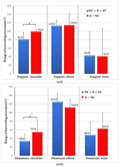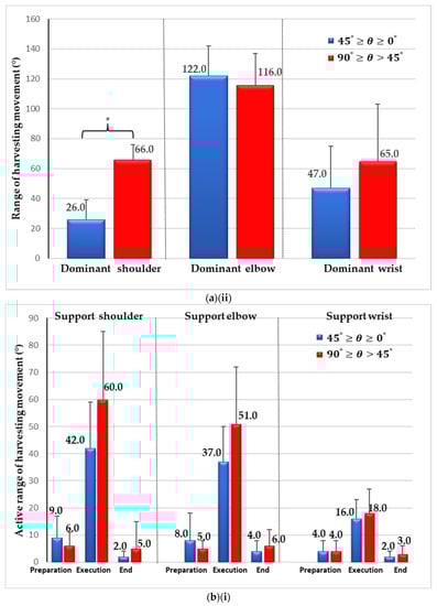 Furthermore, working with an initial support shoulder range of harvesting movements of θ > 90° generated a reduction in the support shoulder flexion and the ulnar deviation active range of harvesting movements of the dominant wrist at the preparation phase, by 9.0° and 5.0°, respectively. Nevertheless, this study found that the initial dominant shoulder posture did not exert any effect on the active range of harvesting movements of the support arm. However, there was an effect from the initial dominant shoulder posture on the maximum range of harvesting movements of the dominant shoulder and the active range of the harvesting movement values of both the dominant shoulder extension and elbow flexion at the execution phase. However, there was no reduction in the active range of harvesting movements in the dominant shoulder and elbow, with the increase observed for the initial dominant shoulder range of harvesting movement.