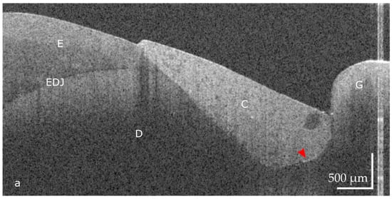 Figure 1a,b shows exemplary SD-OCT cross-sectional images with interfacial gap formations on enamel and dentin, as used for the analysis.