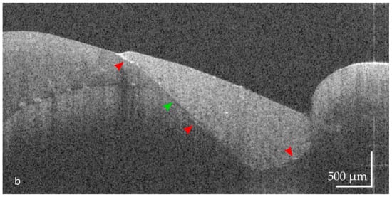 Tooth 45. The Class V cavity was restored with SbM/Amaris. The OCT cross-sectional images of two slices of the restoration show composite (C), enamel (E), dentin (D), the enamel-dentin junction (EDJ), and the gingiva (G). Interfacial adhesive defects (bright lines, red arrow heads) appear on both dentin (a,b) and enamel (b), and their lengths can be determined. Partially, the adhesive layer also appeared (green arrowhead, dark interfacial zone). Scales refer to refractive index n = 1.0.