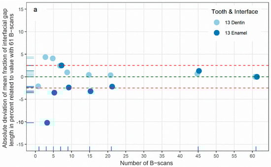 Figure 2a–d shows the trends of the calculated mean fraction for interfacial gap length at enamel and dentin as a function of the number of underlying B-scans based on the absolute deviations from the values given for 61 B-scans. As the number of B-scans increases, the mean values approach a range of the width of about 5%. The approximation to the true mean (N → ∞) becomes apparent when all B-scans are included (Figure 3, exemplarily for dentin of tooth 45). In Figure 4a–f, an example of semi-automatic 3D segmentation of the tooth–composite interface is demonstrated.