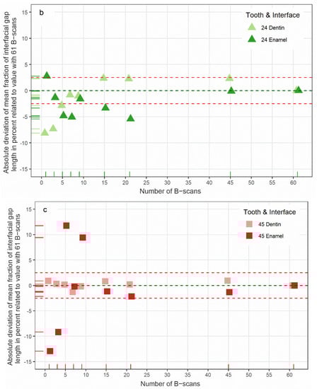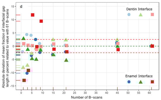 Scatter plots for teeth 13 (a), 24 (b), 45 (c), and for all teeth (d). The plots show the absolute deviation of the weighted mean fraction of the interfacial gap length (enamel and dentin) from the value using 61 cross-sectional images as a function of the number of B-scans (N: 1, 3, 5, 7, 9, 15, 21, 45, and 61). The red dashed lines indicate the (statistical) range of ±2.5% of the deviation of means, compared to 61 B-scans. Depending on the restoration examined, their deviation was up to ±13%, with less than 15 B-scans.