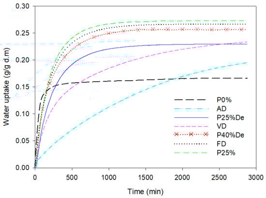 The water sorption kinetics of all kinds of dried samples were determined according to the procedure described by Jakubczyk, et al. [42]. The sample was weighed automatically (PW-Win software, Radwag, Warsaw, Poland) every minute up to 48 h during storage in a chamber with a relative humidity of 75.3% (saturated NaCl solution). The water uptake (g/gd.m.) by samples was calculated and presented during the time of the sorption experiment as the sorption kinetics curves.