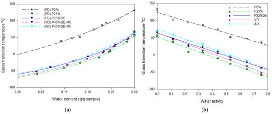 The parameter Tgs of the Gordon–Taylor model (Equation (8)) showed that the drying method of gels with the same composition (P40%DE) did not affect the Tgs values, but the k parameter obtained for the vacuum-dried sample was significantly higher than for the air-dried gel (Table 4). The k parameter is related to the plasticising effect of water. Higher value of k can be linked with a decrease in the glass transition temperature of the sample [60,62]. Lower susceptibility to water sorption of air-dried gels can be linked to the higher glass transition temperature. The increase in pulp addition caused a slight increase in Tgs (Table 4). Fongin et al. [60] stated that the glass transition temperature of anhydrous sample Tgs should be independent of pulp content in freeze-dried mango powder because the solid matrix of pulp is intrinsically crystalline. However, the increase in apple pulp addition in freeze-dried gels caused the increase in low molecular sugars and their presence affected a slight decrease in glass transition temperature. The addition of maltodextrin and a lower amount of incorporated pulp affected a fabrication of dried gels with higher stability (the possibility of structure collapse and the changes in texture of the product can be limited).