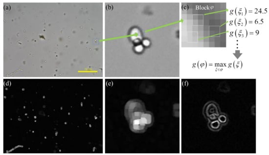 The calculation process of local maximum gradient method. (a) is a fecal microscopic image with fungal spores. (b) is a local enlargement image of a fungal spore in (a). (c) is a 8 × 8 image patch, which is defined as block . (d,e) is the feature image of (a,b) calculated by local maximum gradient method with and equal to 1. (f) is the feature map of (b) calculated by Tenengrad method. (d–f) are visual images after normalizing image pixel value to 0–255.