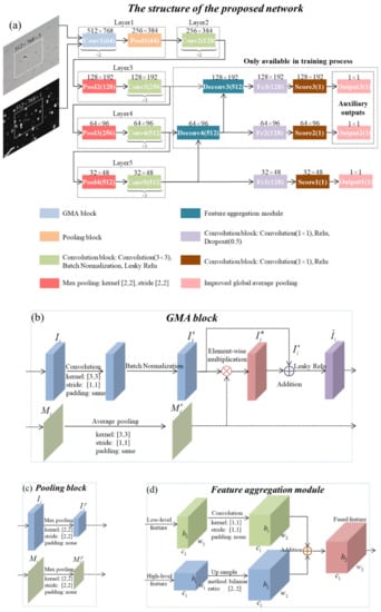 The structure of the proposed GMANet is shown in Figure 3a and the framework is based on the VGG16 [27] architecture. Through comparative experiments, we found that the performance of VGG16 is similar to that of other backbones, such as resnet50. Considering the simplification of the model, VGG16 was used as the backbone. The gradient image extracted by the local maximum gradient method was introduced into the CNN as an attention map, and Figure 3b shows the specific structure of the convolution block with MA, namely the GMA block.