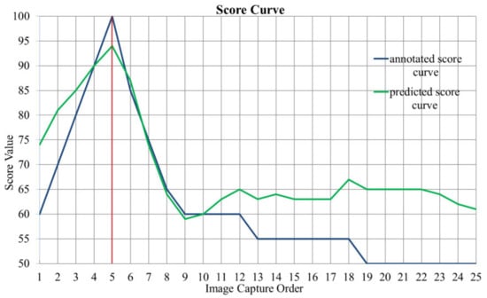 In the training process, we also tried to use the model with the largest average SROCC value as the optimal model, but the model prediction accuracy was unstable. As shown in Figure 7, for one fecal microscopic image group in the test set, the blue and green curve represent the predicted score curve calculated by model L1 (Round 3) and the annotated score curve, respectively. Although the image capture order is equal to in this image group, the predictions of blurred image scores are inaccurate, leading to a low SROCC value, which is 0.5016. Considering that our goal was to find the clearest image, we only regarded the SROCC value as a reference, not as an evaluation metric for model selection.