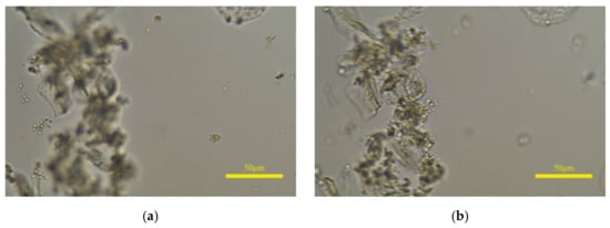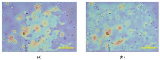 There are still differences between the prediction of the proposed model and the perception of HVS. If leucorrhea microscopic images contain epithelial cells with a large size, the model will predict the clear image of epithelial cells as the clearest. Shown in Figure 12a is the annotated clearest image in one image group, and (b) is the predicted clearest image. The white blood cells and fungal spores in (a) are clear, and the epithelial cells are defocused but still can be recognized; the situation in (b) is the opposite and the white blood cells or fungal spores cannot be identified. If (b) is input into the object detection algorithm, the qualitative judgment result may be inaccurate. Furthermore, the rescaled size of 768 × 1152 and the 8 × 8 size of are the optimal parameters selected after multiple tests. As the sizes of and the image increase, the “acc” value on the leucorrhea dataset gradually decreases. When the image size is 1024 × 1536 and the size of is 32 × 32, the “acc” value drops below 70%.