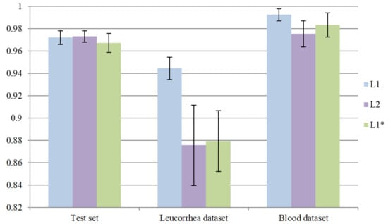 In this part of the experiment, we introduced MA into Layer2 to verify whether the model performance could be promoted. Similarly, L1 was used as a pre-trained model for transfer learning. After training 40 epochs, the optimal model with minimum on the validation set was defined as L2. In addition, we further verified the effect of two-stage training. We directly trained the network with MA into Layer1 and the optimal model with minimum on the validation set was defined as . L2 and need to meet the requirement that “acc” is higher than 98%. Similarly, we repeated the whole training process five times for model L2 and . The comparisons between L1, and L2 are shown in Figure 9. To simplify the process of comparing, we only demonstrated the average “acc” of three models. It can be seen that further introducing MA into Layer2 can slightly improve the performance on the test set but greatly reduces the performance on the leucorrhea dataset. Both L2 and over-fit on the feces dataset. As a result, directly training the network with MA is less effective than two-stage training.