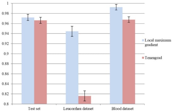 To verify the effectiveness of the local maximum gradient method, we adopted the frequently used Tenengrad [7] method to compute a gradient image as an attention map. We retrained L1 based on the L0 in Section 4.3, and the same training process and optimal model selection criterion were used. The comparison of average “acc” on the test set, leucorrhea dataset, and blood dataset is shown in Figure 10. It can be seen that using Tenengrad to compute the attention map could lead to over-fitting on the feces dataset. The local maximum gradient method, which concentrates on local regions rather than edges, is more suitable for microscopic image quality evaluation.