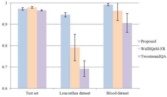 In this part of the experiment, we compared the proposed model with two deep-learning-based methods: TwostreamIQA [15] and WaDIQaM-FR [31]. TwostreamIQA uses the gradient image as the features to be learned. WaDIQaM-FR adds a patch weight estimate module at the end of the feature extraction layers, and the predicted score of each image is the weighted sum of all patch scores. WaDIQaM-FR is a kind of FR-IQA method that needs a reference image. We used the assumption in [32]—that is, the clearer the image is, the greater the difference between its Gaussian blurred image and the original image is. A Gaussian blur operation with a kernel size of 21 and sigma value of 3.5 was performed on all datasets, and then the original images and corresponding Gaussian blurred images were used as reference images and distorted images, respectively. We repeated the training process five times and adopted a similar optimal model selection method. The comparison of average “acc” on the test set, leucorrhea dataset, and blood dataset is shown in Figure 11. We also tested the WaDIQaM-NR [31] method, but its prediction accuracy on the validation set was lower than 97%.