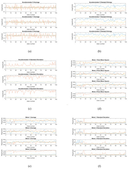 For accelerometer and RCOU signals, the root mean square (RMS), standard deviation (STD), average (AVG), and sample entropy were applied to abstract the feature from the original signal. Additionally, the sample entropy was applied to the accelerometer because it is suitable for analysis of complex signals and identifying obscure patterns. In Figure 5, a simple demonstration of different kinds of states shows the discrepancy in magnitude between the features. It can be seen that the magnitudes of AVG and STD of the damaged propeller were larger than the others. However, it is difficult to distinguish non-fault and motor screw loosening using AVG and RMS, in addition to the STD features of both the PWM signal and accelerometer, because of the smaller difference. Nonetheless, the sample entropy is a powerful characteristic in this circumstance, and enables classification of slight differences. In Figure 5b, the difference between the three kinds of states can be clearly distinguished.
