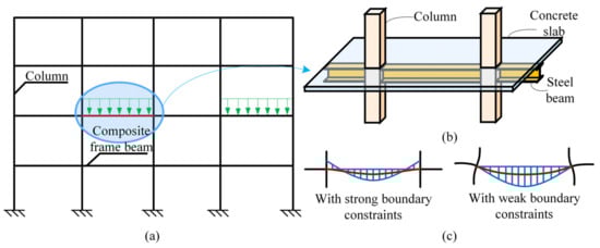 Composite frame structural systems have been widely employed in high-rise buildings, girder bridges, and other structures with large span and heavy loads, because of their favourable structural performance and economic benefit [1,2,3,4,5]. Compared with simply supported beams, the continuous steel–concrete frame beams can obtain a significant increase in structural stiffness, such that they have the advantages of higher span ratio, less deflection, and fundamental frequency of vibration. However, for a continuous composite beam in frame structures, the concrete slab over the intermediate supports suffers a tension condition and may be cracked when in service. Due to the cracking of the concrete slab under negative bending, the sectional flexural stiffness values of the continuous composite beams in the positive and negative moment areas are different. The varied sectional flexural stiffness along the member length induces a remarkable reduction in the integral rigidity of the composite frame beams and should be considered in their limit-state analysis [6]. To date, many researchers have focused on the deflection analysis and design method of the composite beams with full and partial interactions [7,8,9,10]. Moreover, for a frame beam under vertical loads, the distribution of the bending moment and the cracking region are closely related to the deformation capacity of the beams and the columns connected to it, i.e., the rotational constraint condition at the frame beam end. This complex boundary condition increases the difficulty in evaluating the flexural stiffness of the continuous composite beam.