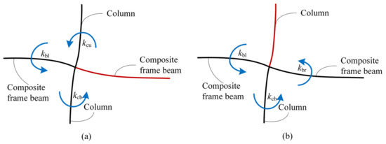 Composition of end rotation constraints stiffness of the beams and columns in the frame. ((a) Rotation constraints at beam ends; (b) Rotation constraints at column ends).