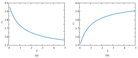 Variation in c1 and c2 with beam-to-column line stiffness ratio. ((a) Relationship between c1 and δ; (b) Relationship between c2 and δ).