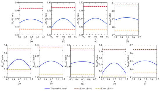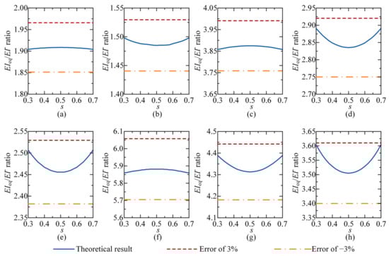 Generally, the values of s range from 0.3 to 0.7 in engineering practices. When variable s = 0.5, the constraint stiffness at both the beam ends are the same, and, when it deviates from 0.5, the difference between them increases. By keeping parameters α and ktot constant, the theoretical calculation results of the equivalent flexural stiffness of the composite beam are obtained, as shown in Figure 5. In the figure, the vertical coordinate axis represents the stiffness ratio of the composite beam to the steel beam, EIeq/EI−, and the horizontal coordinate axis represents the variation in s.