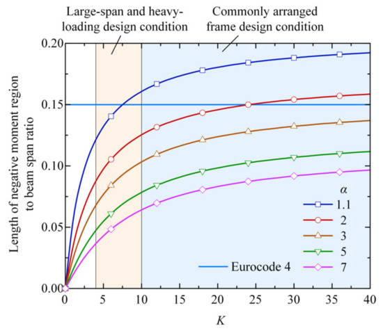 When parameter K is fixed, the length of the negative moment region decreases with the increase in parameter α, i.e., the ratio of the linear stiffness of the composite beam before and after the concrete slab cracking. This is because, for a composite beam with a large sectional flexural stiffness in the non-cracked area, a large proportion of the internal force is shared by the positive moment region, and consequently, the cracking area, i.e., the length of the negative moment region, decreases.