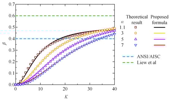 For the convenience of structural design in engineering applications, an equivalent flexural stiffness represented by the weighted average of EI+ and EI− is frequently used to evaluate the integral stiffness of a composite beam. The weight factor of the equivalent stiffness—parameter β in Equation (1)—can be calculated using the theoretical model presented in Section 2. The relationship between the weight factor and the rotational constraint stiffness (described by parameters K and α) is presented in Figure 7.