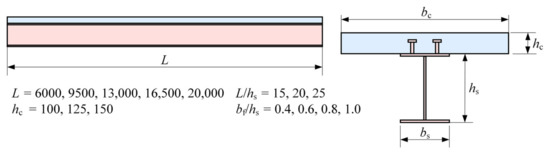 First, for conducting a parameter analysis, numerous design cases were selected from practical engineering. As shown in Figure 8, the analysed examples consisted of 180 composite beams with different cross-sections, in which the span length, L, ranges from 6 to 20 m. The effective slab width was calculated using the stiffness amplification coefficient, α, and the slab thickness ranged from 100 to 150 mm. The span-to-steel beam height ratio, L/hs, ranged from 15 to 25, and the steel beam flange width to height ratio, bf/hs, ranged from 0.4 to 1.0. In addition, the steel beam flange thickness, tf, and the web thickness, tw, were also designed to satisfy the requirement of a compact section.
