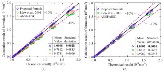 Subsequently, the analysed cases were divided into two groups based on the constraint boundary at the beam ends. In one group, parameter K ranged from 4 to 10, which represents the composite beams designed with large spans and heavy loads. In the other group, it ranged from 12 to 36, which represents the common composite frame beams arranged with equal spans. The calculated results of the proposed formula in this paper were compared with those obtained from the existing method, including the recommended methods of ANSI/AISC, Eurocode 8 [36], and Liew et al., as shown in Figure 9. Note that the related regulations in ANSI/AISC and Eurocode 8 are similar; thus, the results calculated by both methods are plotted as one. Compared with the theoretical methods of the equivalent flexural stiffness calculation, the formula proposed in this paper had a margin of error of less than 1%. In comparison, the average errors of the methods suggested by ANSI/AISC and Liew et al. were more than 10%, which is because of ignoring the constraint boundary condition at the beam ends.