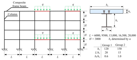 To consider the bearing mechanism of a composite beam in a frame structural system, the equivalent flexural stiffness calculated by the proposed formula was further validated by conducting an FE analysis of the entire process deformation of a frame structure. The numerical model was built based on a four-story and five-span plane frame, whose detailed design parameters are provided in Figure 10. As the main variable parameter, the spans of the composite beams adopted the values of 6, 9.5, 13, 16.5, and 20 m in the numerical examples. The effective width of the concrete slab in the composite beams was calculated using stiffness amplification coefficient α according to JGJ 138-2016 [33]. In addition, the sectional dimensions of the composite beams were divided into two groups. In one group, the concrete slab thickness, hc, was 120 mm; the span-to-steel beam height ratio, L/hs, was 20; and the steel bam flange width to height ratio, bf/hs, was 0.6. In the other group, the concrete slab thickness, hc, was 150 mm; the span-to-steel beam height ratio, L/hs, was 15, and the steel bam flange width to height ratio, bf/hs, is 1.0. For all the FE models, the parameters of steel beam flange thickness, tf, and web thickness, tw, were designed to satisfy the requirements of width-thickness ratios specified in GB 50017-2017. Based on the principle of ‘strong column–weak beam’ in structural design, the sectional sizes of the columns changed with the span of the frame beam, and the axial compression ratio of each column was set as approximately 0.4 to ensure that the columns do not yield before the beam achieves the ultimate limit state.