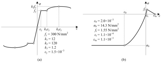 Skeleton curve of the stress–strain constitutive law used for steel and concrete. ((a) Stress−strain relation of steel; (b) Stress−strain relation of concrete).