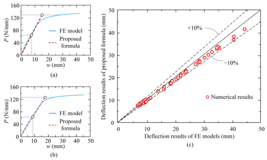 A uniformly distributed load in the vertical direction was applied to the middle and side spans of the composite frame beams located in the first and fourth stories. The applied loads started at zero and continued to increase until the frame beams completely entered the plastic stage; thus, the entire evolution process of the deflection can be traced for the considered beams. The simulated load–deflection curves of some typical frame beams are presented in Figure 12a,b. By defining the point when the applied load achieves half of the ultimate stage as the normal service stage, the corresponding deflection at the middle of the span was compared with the results calculated by the proposed formula. The comparison suggests that the simplified formula expressed in Equation (18) can predict well the flexural stiffness of the composite beams in the service stage. For the 40 numerical examples of composite beams shown in Figure 12c, the vertical deformations calculated by the recommended formula agree well with the FE analysis results. The calculation errors of the investigated cases are all within 10%, which demonstrates that the proposed formula has good accuracy for evaluating the equivalent flexural stiffness of the composite beams.