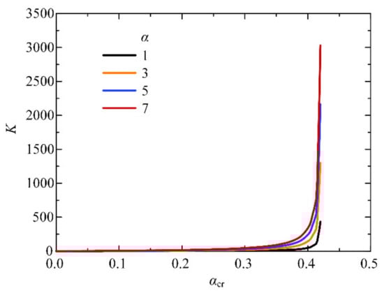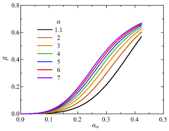 In practical design, critical parameter K can be calculated using coefficients α and αcr in Equation (31). The weight factor of the equivalent stiffness, β, can also be calculated using this simplified method, and the relationship between parameters β and αcr is presented in Figure 15.