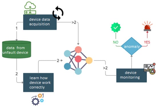 An overview diagram of the process of learning the correct device by the algorithm and on-line monitoring. Numbers 1 and 2 mean consecutive steps and “>2” system operation after initial configuration.