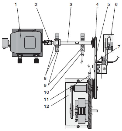 Setup for simulation of vibrations from belt drive. It consists of drive unit (1), elastic claw coupling (2), short shaft (3), small belt pulley for belt drive with V-belt (4), reflective mark on the V-belt (5), magnetic clamp with steel plate (6), reference sensor aligned with reflective mark on V-belt (7), setting rings for axial attachment (8), bearing block (9), acceleration sensor 1 and 2 (10/11), and brake and load unit (12).