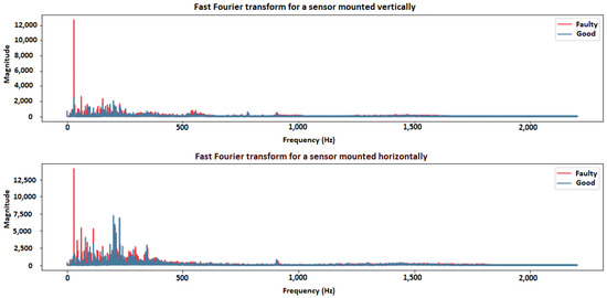 The fast Fourier transform performed for the case under study confirmed the folding of the two previous signals. The horizontal sensor showed the greater influence of the belt transmission fault, while the vertical sensor showed the influence of both faults through the maximum magnitudes at frequencies below 1 kHz.